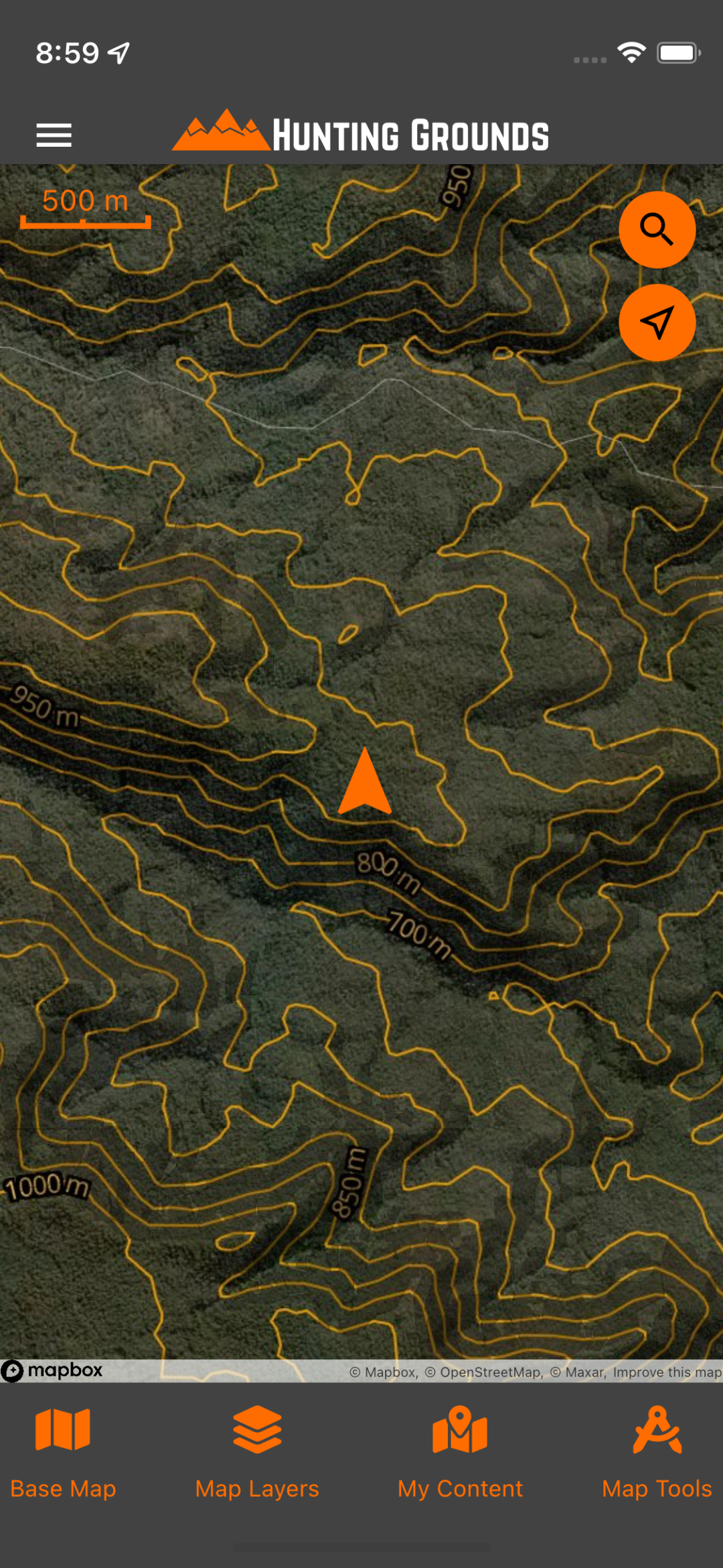Tapping this button will bring up the Hunting Grounds search feature, in the form of a search text field at the top of the map. You can use the Hunting Grounds search feature to search for addresses, places, and even user generated in-app content such as markers and shapes.