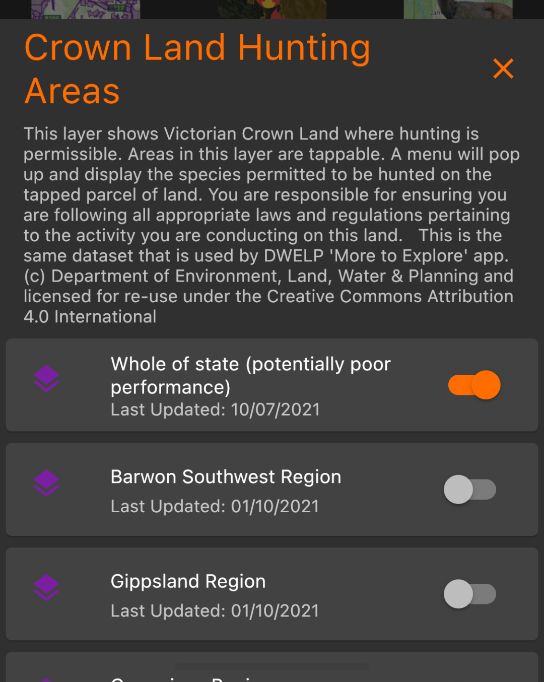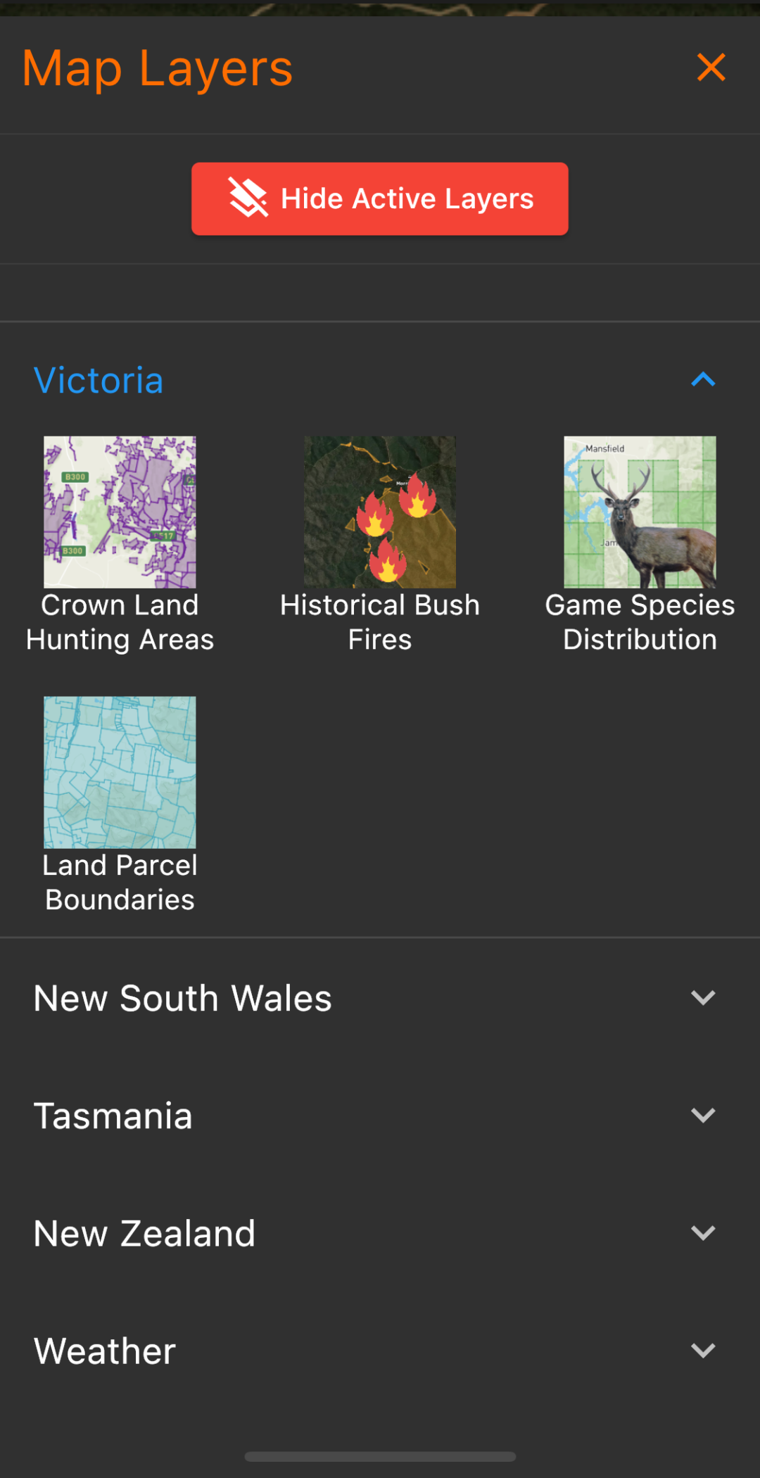 Hunting Grounds has a feature by which you can disable all active data layers in one go. To access this feature, tap on the "Map Layers" icon on the Bottom Menu, and when the "Map Layers" menu appears, tap on the "Hide Active Layers" button up the top.