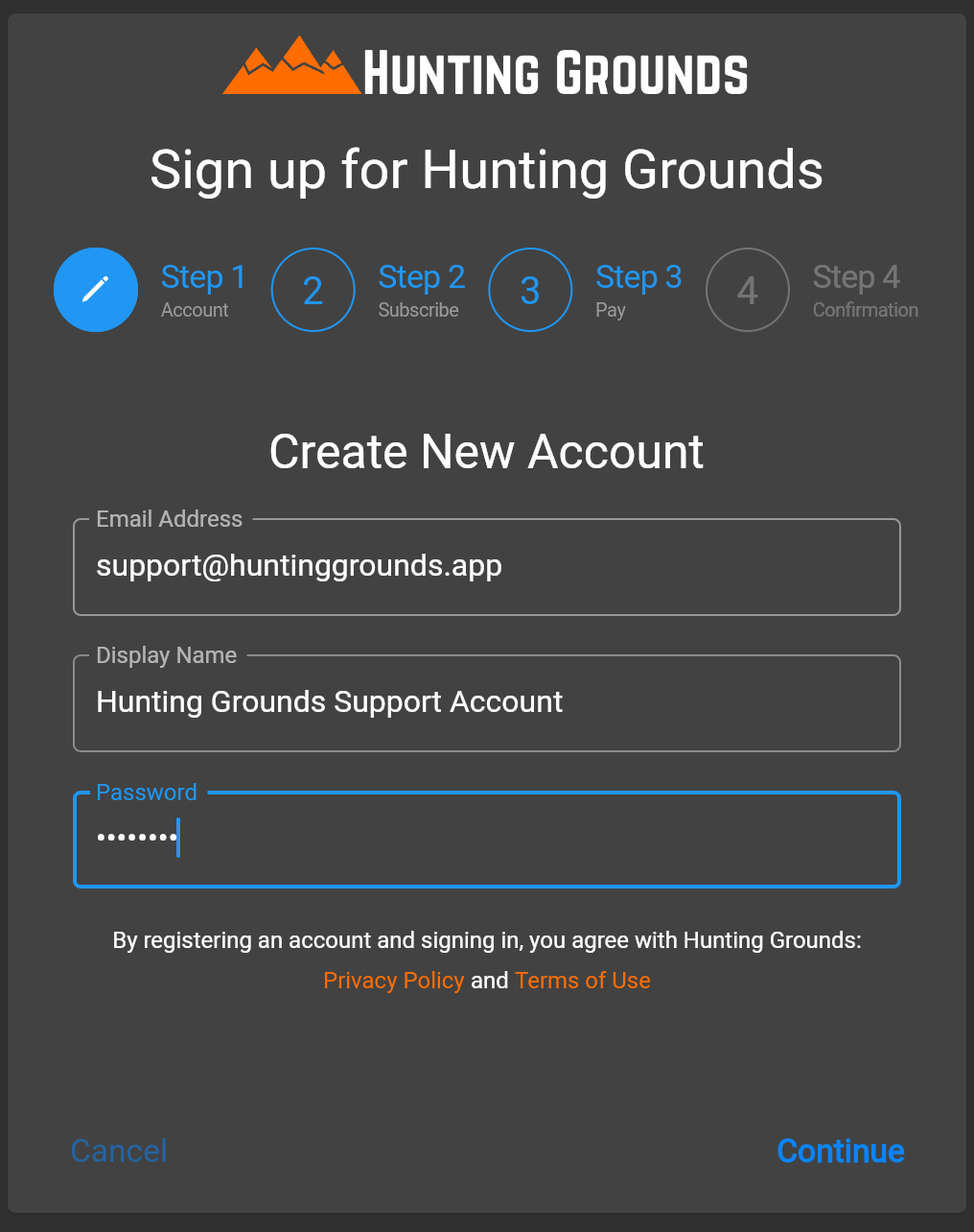 Creating a Hunting Grounds account on the Web (and use a Promotional Code if you have one).