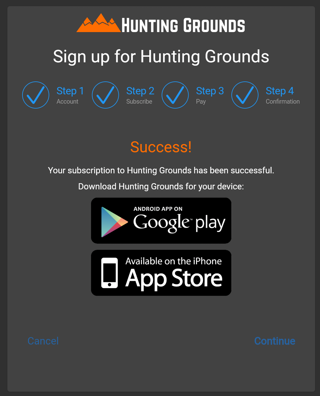 Now all you have to do is download Hunting Grounds for your device (links are available on the confirmation page), login with the credentials you created, and start using Hunting Grounds to plan your next hunt.